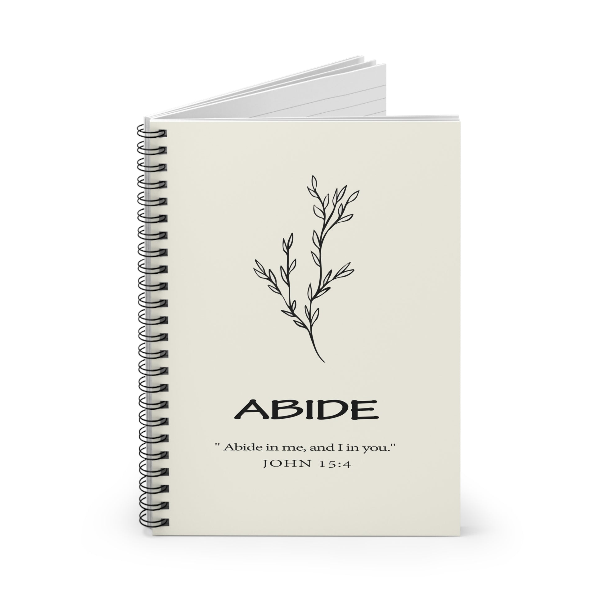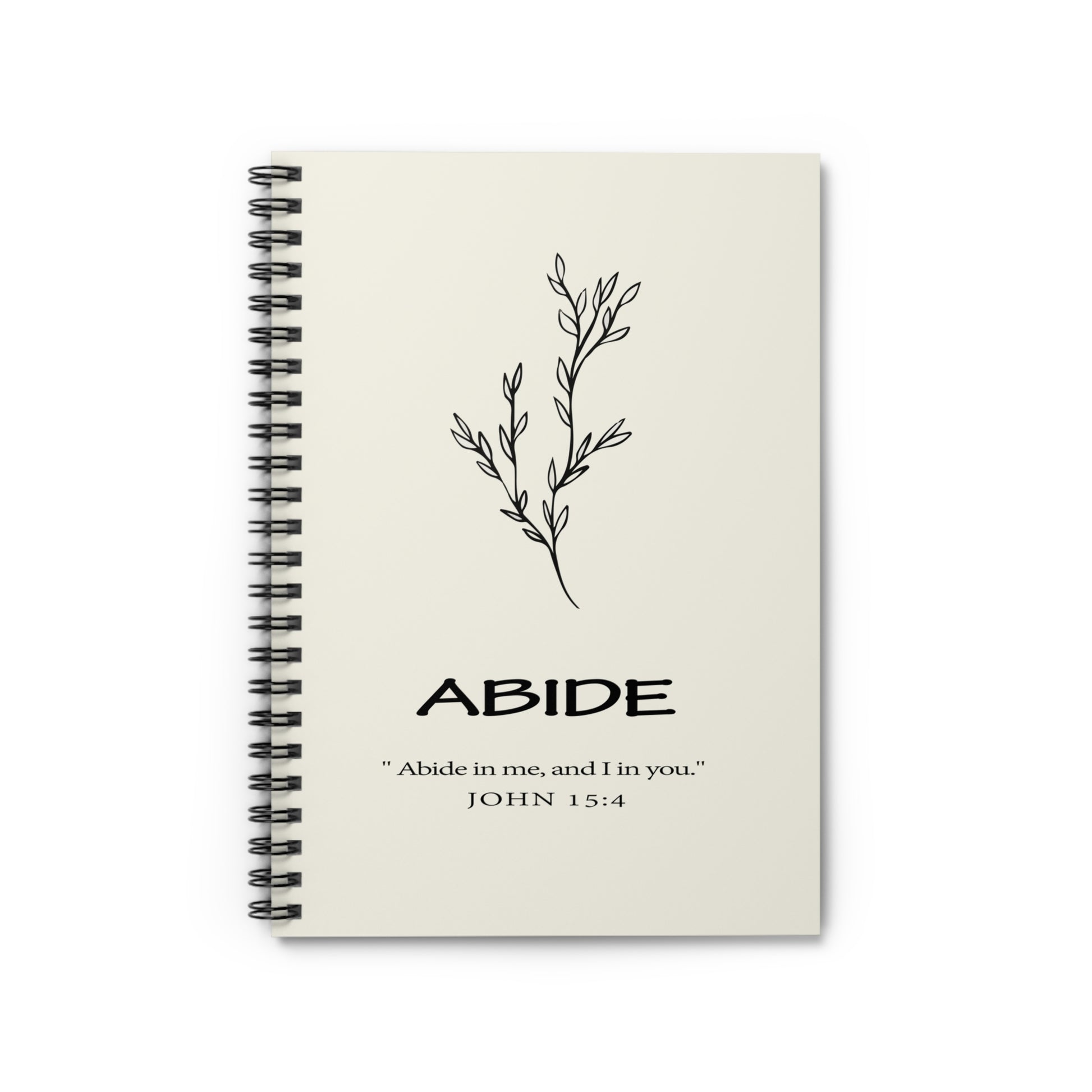 Introducing our "ABIDE" spiral notebook, featuring the inspiring verse from John 15:4: "Abide in me and I in you." This elegant and durable 118-page notebook is designed to be a cherished companion for your daily writing and note-taking needs. With its sturdy metal spiral binding and beautifully printed cover, it is perfect for carrying with you wherever you go.