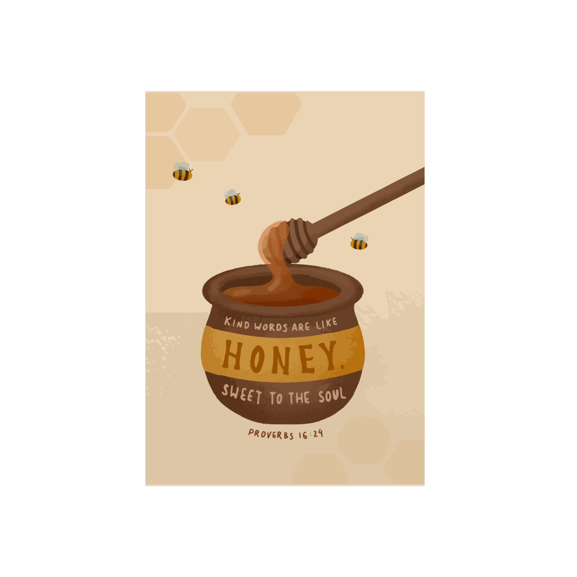 Enhance your space with our Christian metal poster featuring the heartfelt message "Kind words are like honey, sweet to the soul." Crafted from a robust 3mm thick aluminum composite panel, this poster is designed to endure all weather conditions. Its elegant matte finish and pre-mounted hanging hardware make it a timeless addition to any environment, whether indoors or outdoors.