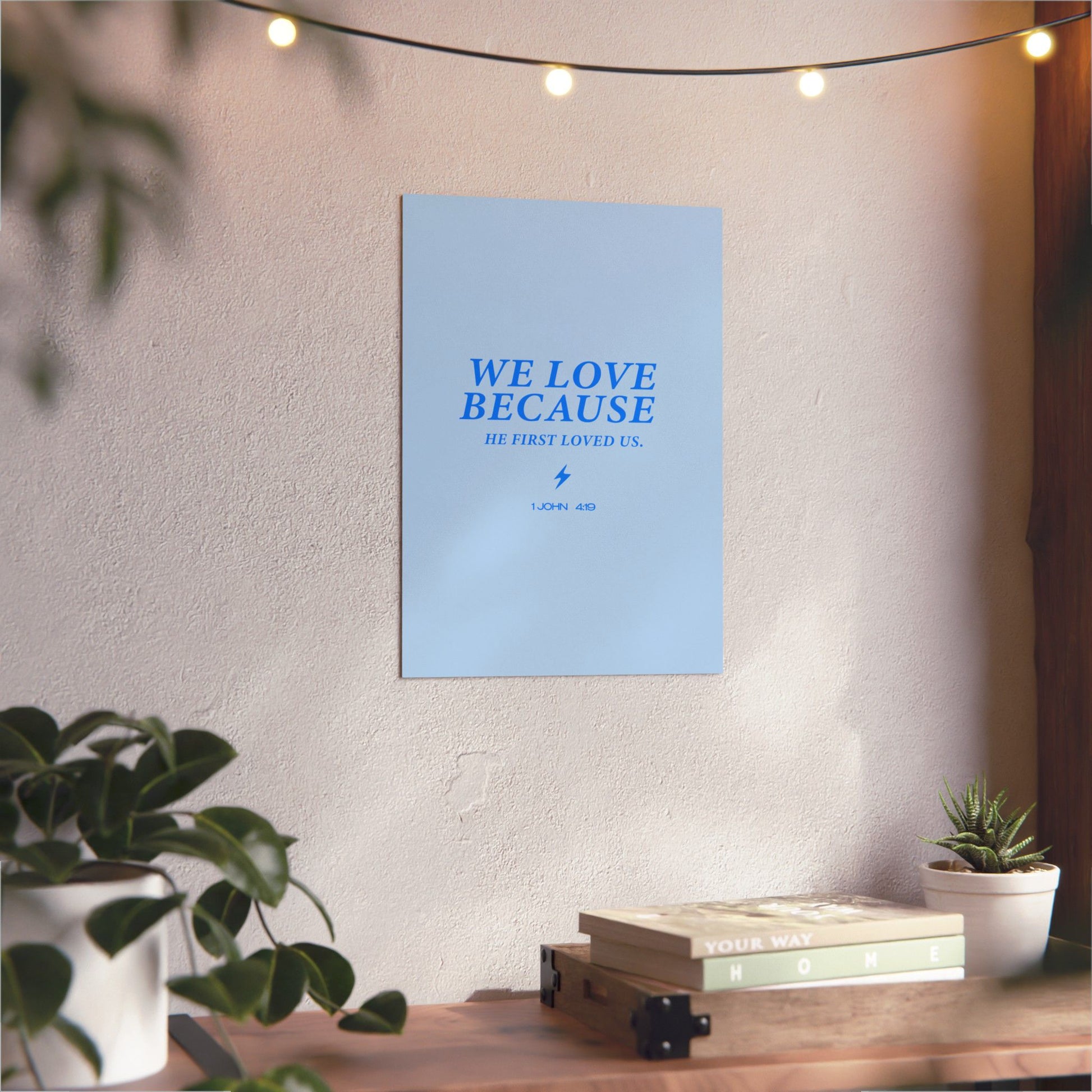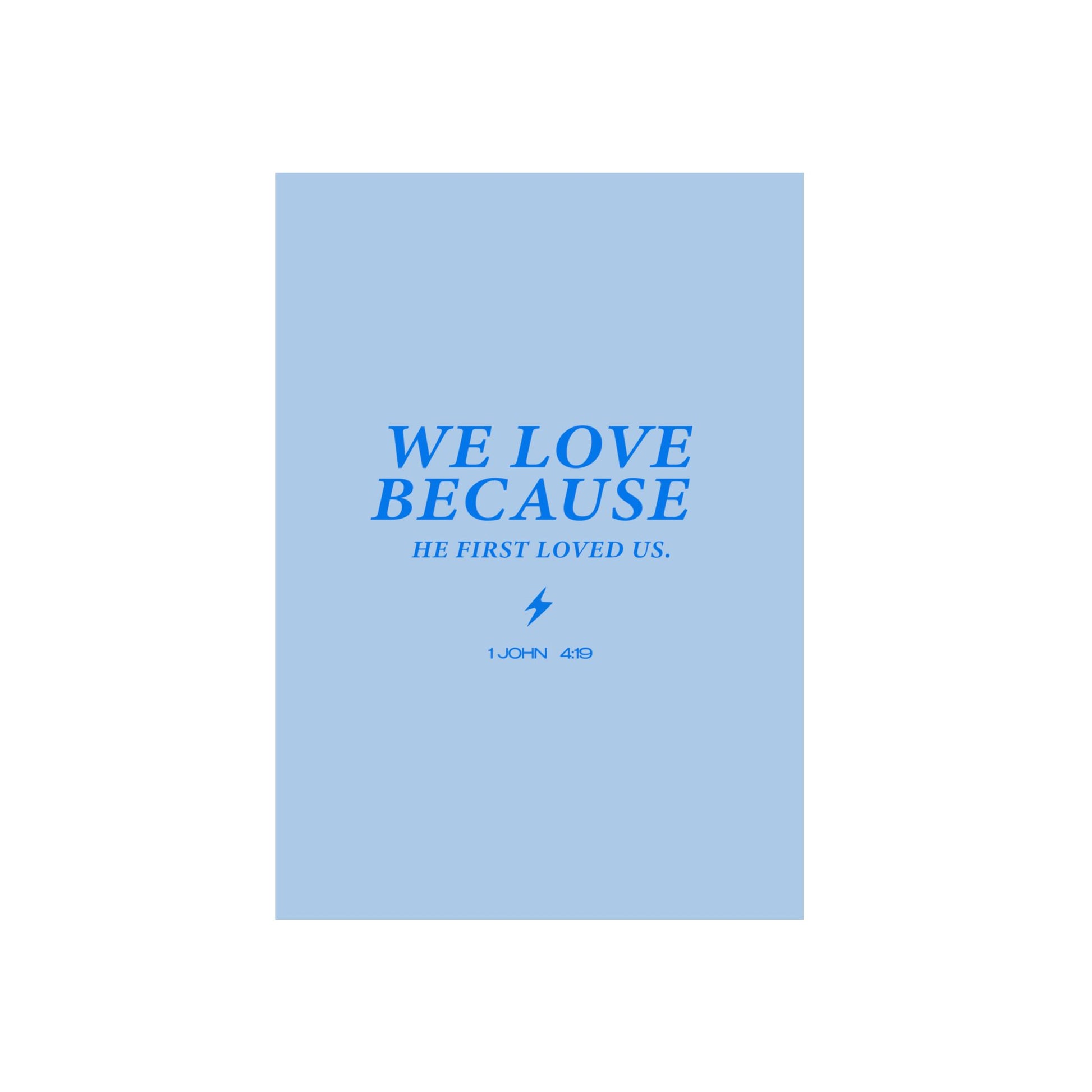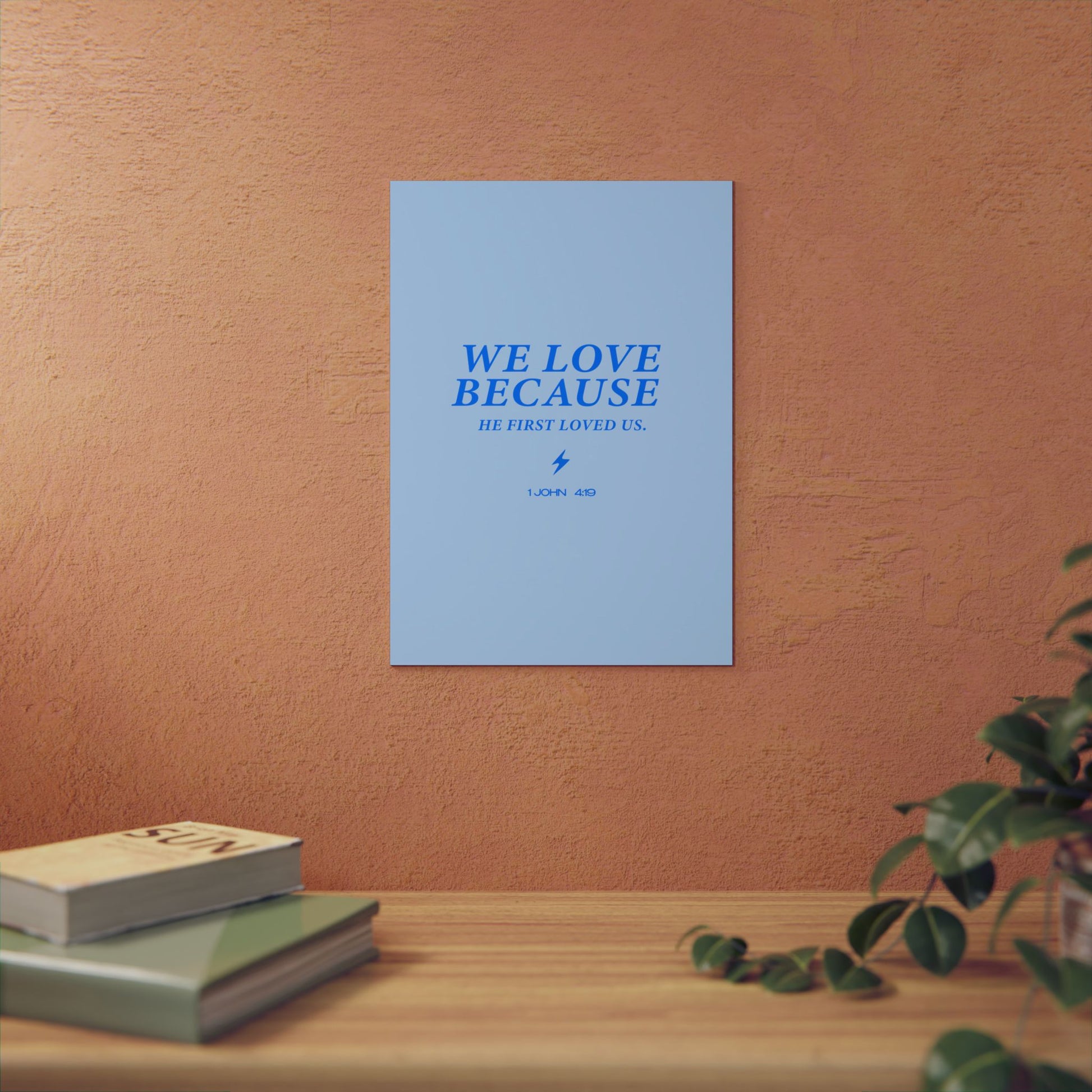 This stunning Christian metal poster features the powerful scripture "WE LOVE BECAUSE HE FIRST LOVED US. 1 JOHN 4:19." Crafted on a durable 3mm thick aluminum composite panel, it’s designed to withstand all weather conditions. With a sleek matte finish and pre-mounted hanging hardware, this poster is perfect for both indoor and outdoor displays, making it a versatile addition to any space.